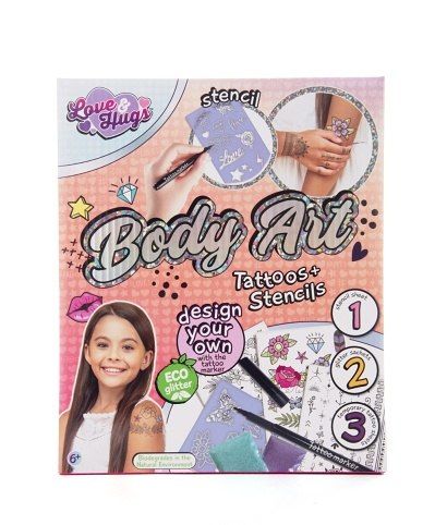 Tetovací sada Love and Hugs – jednoduchá aplikace i odstarnění, množství různých variací pomocí šablon a samolepek možnost použití třpytek. Balení obsahuje 2 pytlíčky se třpytkami, 3 aršíky s tetováním, 1 šablonu a tetovací pero.