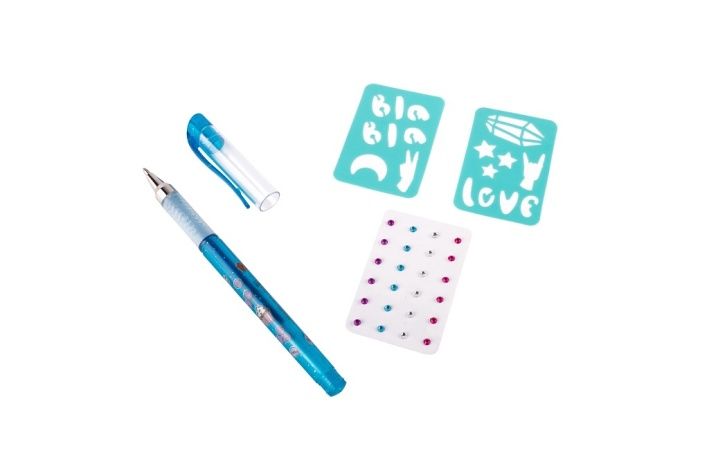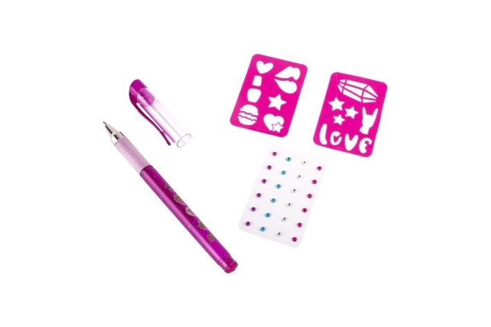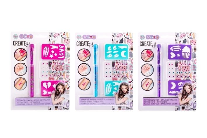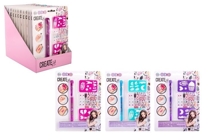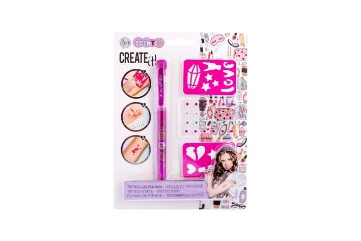 Tetovací sada s voňavým gelovým perem – sada obsahuje gelové, voňavé tetovací pero – 3 různé barvy, samolepící třpytivé kamínky a dva kusy šablon.