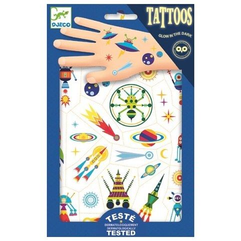 Tetování na kůži s obrázky veselého vesmíru. Balení obsahuje 2 archy. Tetování je dermatologicky testováno a dlouho vydrží. Rozměr balení: 21 cm x 14 cm Návod na použití: vystřihněte vybraný obrázek opatrně sundejte vrchní ochrannou fólii přidržte tetování na kůži a navlhčete zadní stranu papíru 30 sekund na místě pevně přidržte a pak opatrně vrchní papír odendejte Tetování není vhodné pro děti mladší 3 let a pro lidi s citlivou nebo poraněnou pokožkou nebo pro lidi s alergickou reakcí na lepidla. Nedávejte do obličeje, nepolykejte.