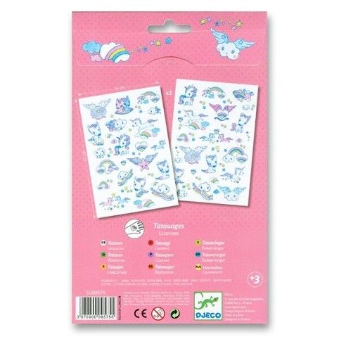 Dětské tetování na kůži s motivem jednorožců, obláčků, duhy a hvězdiček. Balení obsahuje 2 archy. Tetování je dermatologicky testováno a dlouho vydrží.Rozměr balení: 21 cm x 14 cmVhodné pro děti od 3 let.