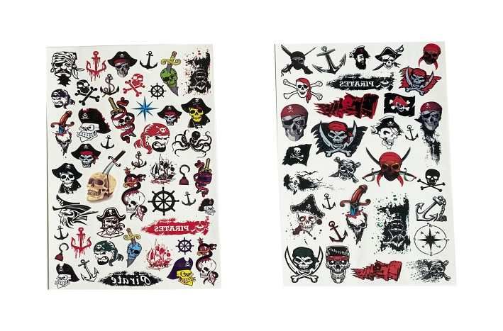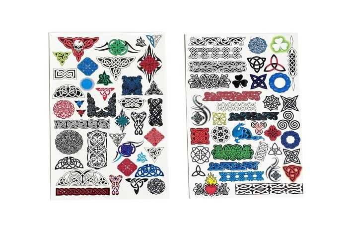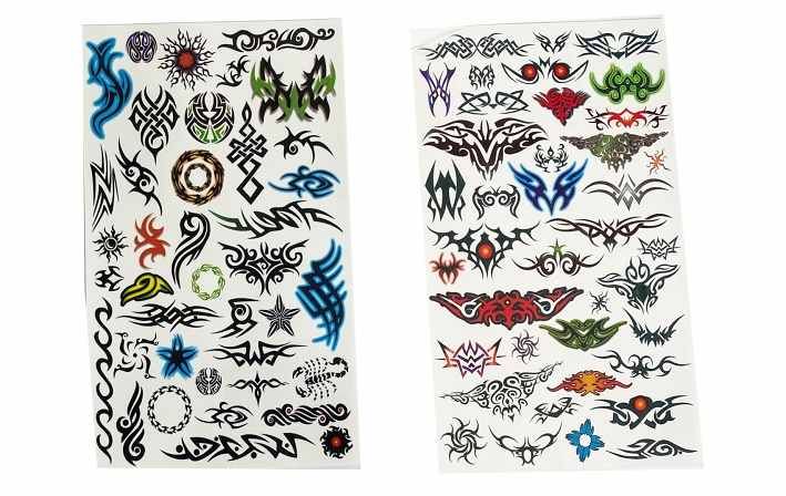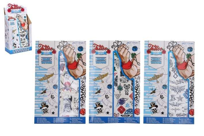 Tetovací samolepky kluci. Více variant v display boxu. Rozměry archu: 15,3x0,1x25cm. Návod na aplikaci na obale: Sloupnout folii, přilepit papír s tetováním na pokožku, namočit a přitlačit houbičkou, sundat opatrně papír.