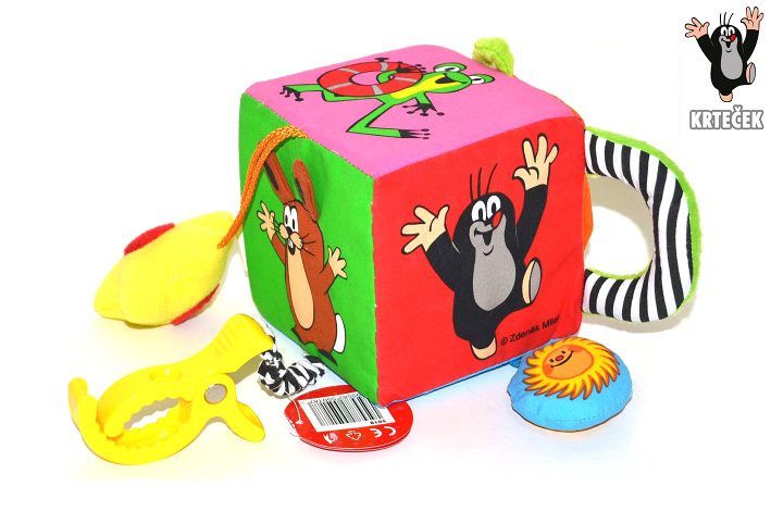 Textilní multifunkční kostka má na každé stěně zobrazen veselý obrázek Krtečka nebo jeho kamarádů. Má 2 uši, díky kterým se dobře drží v malých ručičkách. Po stranách kostky jsou napevno zavěšeny různé drobnosti Rozměr kostky: 9,5 x 9,5 cm.