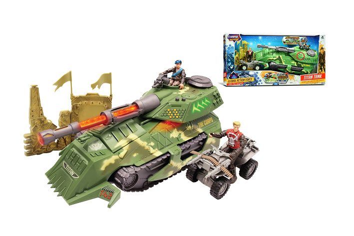 The Corps tank Titan s vojáky. Velikost tanku 39 cm, vojáka 10 cm. Světelné a zvukové efekty. 10 různých zvuků. 3xAA baterie součástí. Obsahuje tank, čtyřkolku, 2 vojáky, barikády.