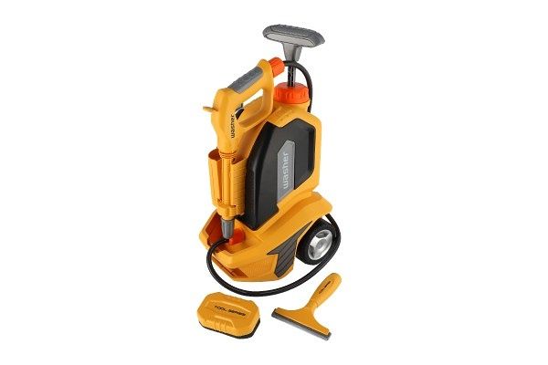 Tato dětská vysokotlaká myčka je skvělou hračkou pro malé pomocníky, kteří rádi napodobují práci dospělých. Naplňte zásobník vodou, vytvořte tlak pomocí pumpičky, zmáčkněte pistol, ze které začne stříkat voda. Upravovat proud můžete pomocí otočného krytu nakonci hadice. Díky kolečkům a rukojeti je snadné vapku kamkoli přemístit. Součástí balení: Tlakový čistič, houbička, stěrka a hadřík.