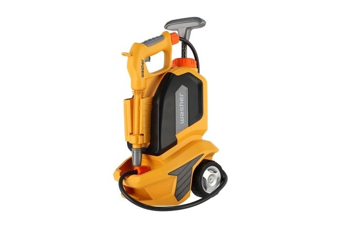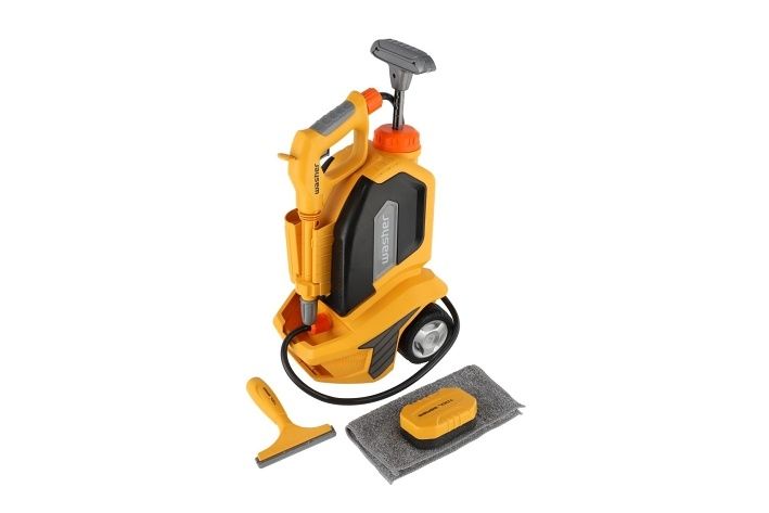 Tato dětská vysokotlaká myčka je skvělou hračkou pro malé pomocníky, kteří rádi napodobují práci dospělých. Naplňte zásobník vodou, vytvořte tlak pomocí pumpičky, zmáčkněte pistol, ze které začne stříkat voda. Upravovat proud můžete pomocí otočného krytu nakonci hadice. Díky kolečkům a rukojeti je snadné vapku kamkoli přemístit. Součástí balení: Tlakový čistič, houbička, stěrka a hadřík.