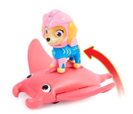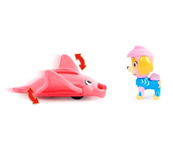Skye ve zbrusu novém neoprenu a její věrná kámoška manta. Usaď Skye na ploutev na hřbetě manty, posunuj mantou kupředu, abys aktivoval třepotavý pohyb jejích ploutví a vyraž do záchranářské akce. Vhodné od 3 let.