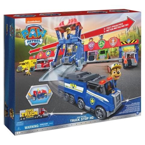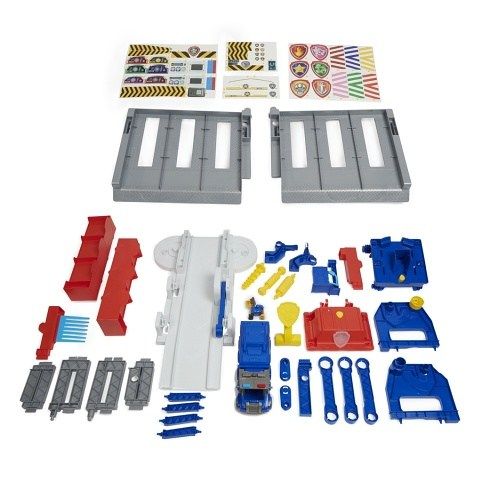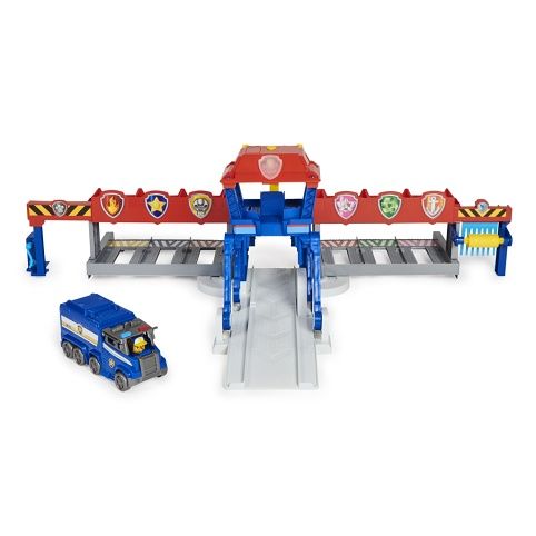 Paw Patrol Big Trucks centrální věž se transformuje na 1 m velkou garáž, která obsahuje garážová místa pro všech 6 záchranářů, čerpací stanici a myčku. Odpalovací zařízení ostartuje auto na záchrannou misi. Garáž má zvukové a světelné efekty a obsahuje figurku Chase s jeho náklaďákem. Na baterie: 2x AA (nejsou součástí balení)