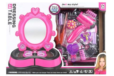Plastový toaletní stolek s příslušenstvím. Obsahuje fén na baterie, žehličku na baterie, hřeben, nůžky, natáčky a další doplňky. Stolek po stisknutí tlačítka nad zrcadlem začne hrát melodii a svítit. Rozměry balení cca 46,5 x 34 x 6 cm. Napájení stolečku na 2 AA baterie (nejsou součástí balení), napájení fénu na 2 AAA baterie (nejsou součástí) a napájení žehličky na 2 AAA baterie (nejsou součástí). Věk 3+