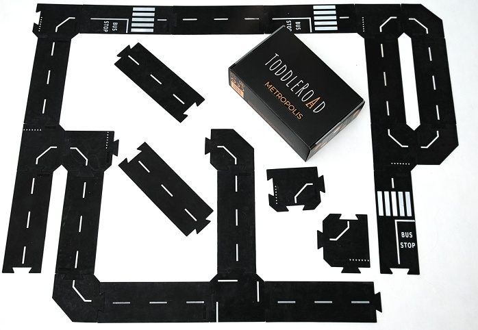 SADA METROPOLE o celkové délce 6 metrů a šířce silnic 10 cm se skládá z 26 silikonových oboustranných prvků: 14 dlouhých rovinek (délka 29,5 cm) včetně 3 autobusových zastávek a přechodů pro chodce, 4 zatáček a 8 křižovatek ve tvaru T, které umožňují postavit i kruhový objezd. Jednotlivé díly mají oboustranný potisk, který dětem umožňuje větší rozmanitost staveb. Součástí hračky je i funkční kartonová krabice s vnitřním potiskem města a parkoviště, která zároveň slouží i jako úložný box. Vhodné pro děti od 1 roku.