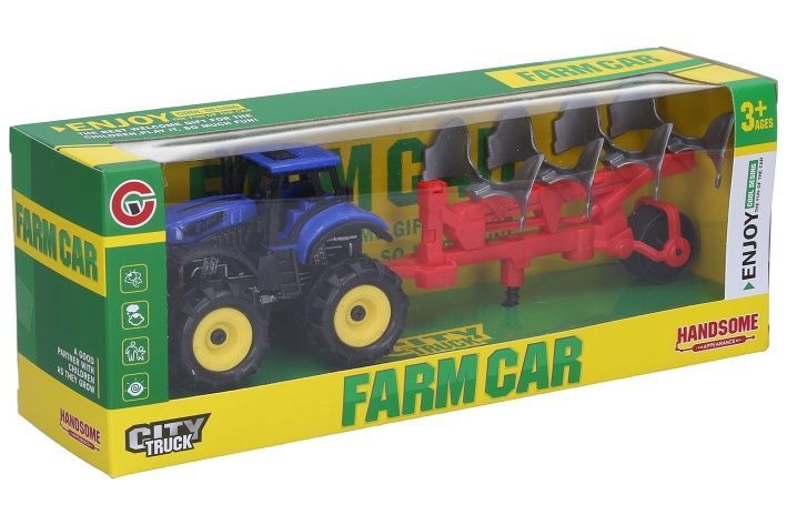 Traktor na setrvačník s pluhem. Rozměry traktoru 25x7x7,5 cm. 2 varianty - modrá, zelená.