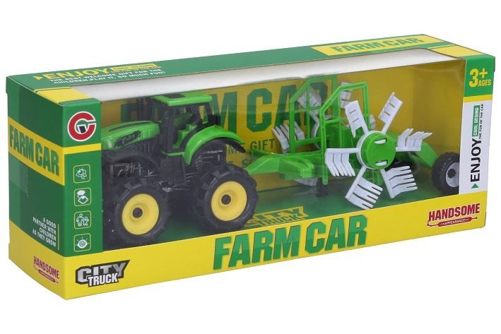 Traktor na setrvačník s přívěsem. Rozměry traktoru 25x7x7,5 cm. 2 varianty - modrá, zelená.