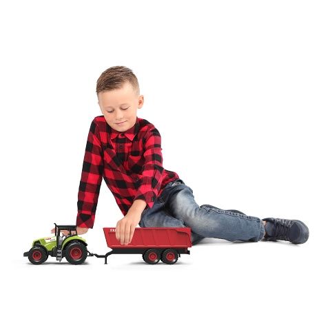 Moderní traktor s vlečkou hračka z kolekce Moje malá farma. Nepostradatelný pomocník pro každého malého farmáře! Vlečku můžeš jednoduše odpojit a traktor využít k dalším pracím. Traktor jezdí na setrvačník a jeho délka včetně vlečky je 36 cm. Zmáčknutím jakýchkoliv ze třech tlačítek traktor vydává reálné zvuky. Traktor funguje na 3x 1,5V AG13 baterie, které jsou součástí balení.