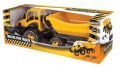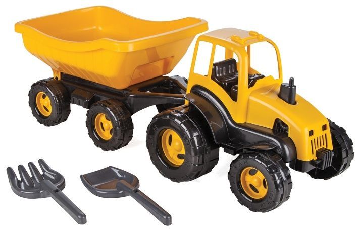 Plastový traktor s návěsem o celkové délce 72 cm.Součástí lopatka a hrabičky.