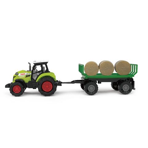 Moderní plastový farmářský traktor s vlečkou a balíky slámy, hračka z kolekce Moje malá farma. Vlečka se dá jednoduše odpojit a balíky sundat. Traktor jezdí na volný chod a jeho délka je 10 cm. Přívěs je v délce 12 cm, celková délka včetně přívěsu je 25 cm. Zmáčknutím tlačítka na traktoru vydává reálné zvuky spolu se světelným efektem. Traktor vyžaduje 3 ks baterií typu AG13/LR44, které jsou součástí balení.