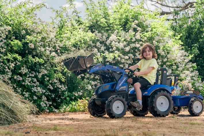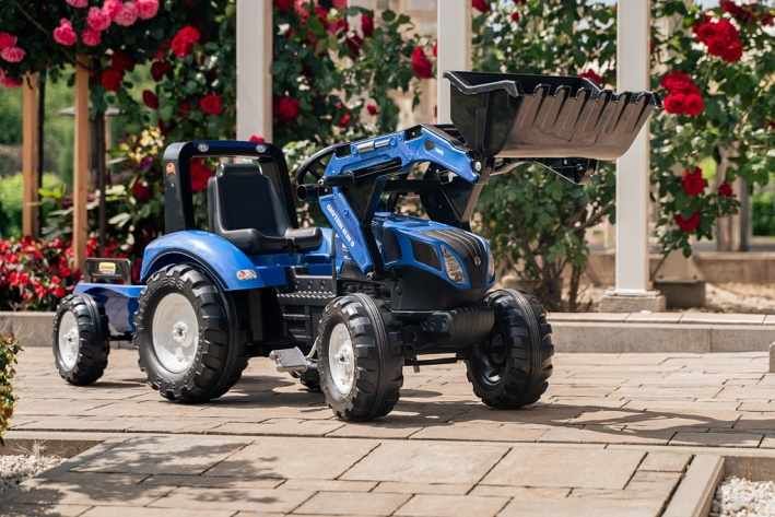 Trakto šlapací New Holland T8 s valníkem a přední lžící šlapací modrý. Součástí traktoru je klakson, valník, přední mechanicky ovládaná lžíce. Z vysoce odolného a kvalitního plastu. Velikost 192×53×66 cm Věk 3+. Všechny traktory Falk jsou testovány na 50kg – dle požadavků evropských norem. Vyrobeno ve Francii.