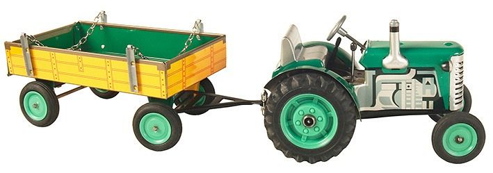Traktor Zetor a valník červeno žlutý, modro žlutý nebo zeleno žlutý. Plechová hračka Traktor Zetor a valník od českého výrobce hraček KOVAP. Hračka je vyrobena z potištěného plechu. Pohon zajišťuje mechanický pérový strojek. Pro kluky od 3 let.