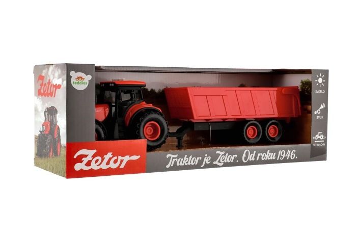 Krásný model zemědělského traktoru Zetor s dlouholetou tradicí, kterou musí milovat snad každý. Vyražte na pole s pořádným traktorem se světlem a zvukem! Traktor s valníkem je nepostradatelný pomocník pro každého malého farmáře! Valník můžeš jednoduše odpojit a traktor využít k dalším pracím. Traktor jezdí na setrvačník. Zmáčknutím tlačítek traktor vydává reálné zvuky a svítí mu světla. Hračka je na baterie 3x AG13, které jsou součástí balení.