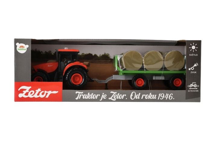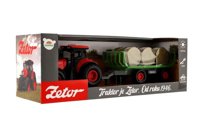 Krásný model zemědělského traktoru Zetor s dlouholetou tradicí, kterou musí milovat snad každý. Vyražte na pole s pořádným traktorem se světlem a zvukem! Traktor s vlekem na seno je nepostradatelný pomocník pro každého malého farmáře! Vlek můžeš jednoduše odpojit a traktor využít k dalším pracím. Traktor jezdí na setrvačník. Zmáčknutím tlačítek traktor vydává reálné zvuky a svítí mu světla. Hračka je na baterie 3x AG13, které jsou součástí balení.