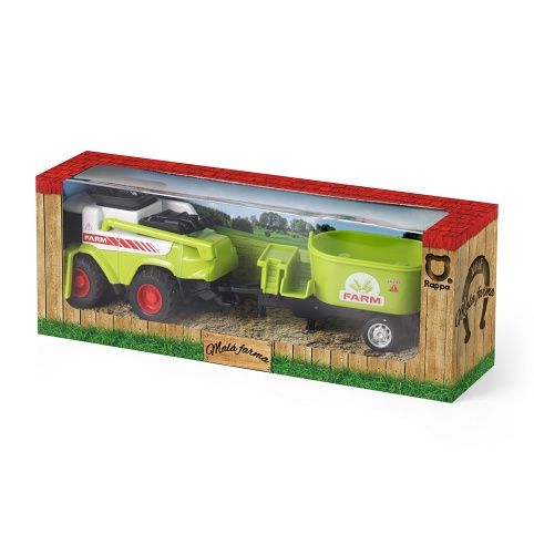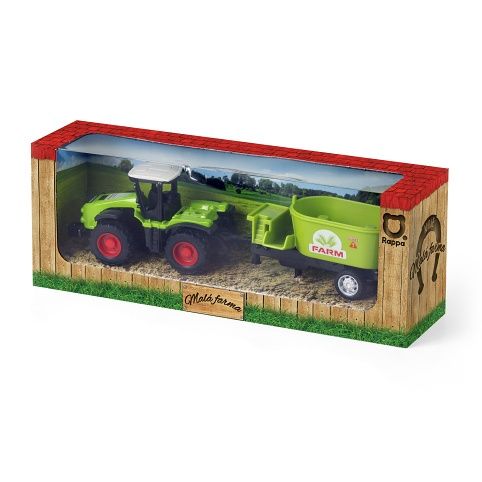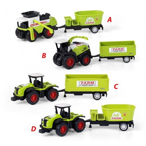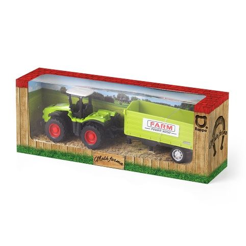 Moderní traktor s vlečkou, hračka z kolekce Moje malá farma. Nepostradatelný pomocník pro každého malého farmáře! Vlečku můžeš jednoduše odpojit a traktor využít k dalším pracím. Traktor jezdí na zpětný setrvačník a jeho délka včetně vlečky je 18 cm. K výběru 4 druhy.