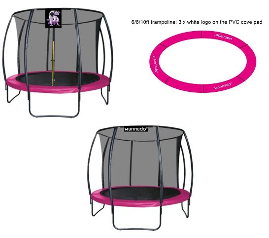 Trampolína s ochrannou sítí. Postavička Meerfun na 30 cm stripu. Logo Wannado. Velikost 305 cm. Růžová barva. 60 pružin. Černé PVC rukávy na sloupcích. Schůdky v černé barvě.