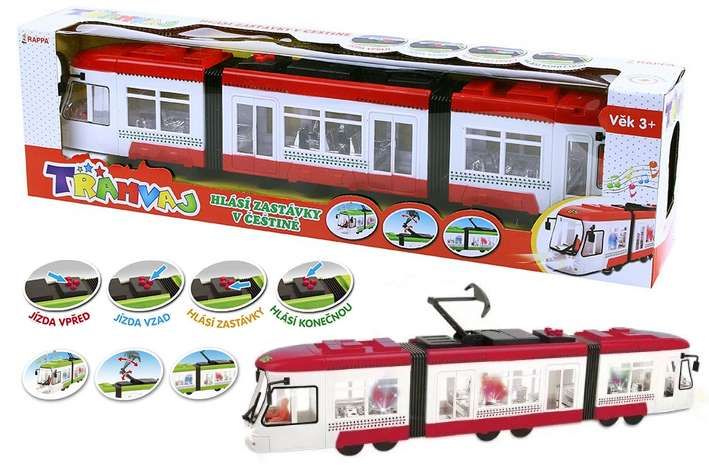 Tramvaj funguje na baterie, jezdí vpřed i vzad, se zvětelnými i zvukovými efekty. Umí hlásit zastávky v českém jazyce. Stačí stisknout tlačítko.