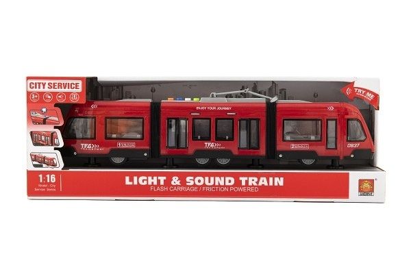 Tramvaj/Vlak plast 44cm na setrvačník na baterie se zvukem se světlem v krabici 48x17x11cm
