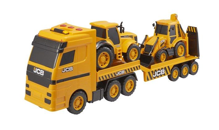 JCB transportér těžké techniky je přepravní auto s traktorem a bagrem.