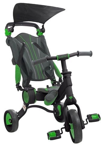 Tříkolka 4v1 Galileo černo/zelená. Tříkolka Galileo má jedinečný a inovativní design díky superkompaktnímu skladacímu systém (Fast Action Fold), díky čemu jí můžete nosit a komkoliv a kdykoliv, protože zabere jen velmi málo místa. Odnímatelné části umožňují tříkolce přizpůsobit se růstu dítěte a hrát různé role v různých fázích vývoje. Tříkolka Galileo má výškově nastavitelnou rodičovskou rukojeť, která vám umožní řídit tříkolku. Velká sluneční stříška poskytuje stín a úkryt před sluncem. Polohovatelné sedátko se sklopným opěradlem, 5-ti bodovými bezpečnostními pásy a bezpečnostními madly zajistí větší pohodlí pro nejmenší při vašich procházkách. Jednotlivé pedály lze použít jako stupačky během fáze kočárku nebo jako pedály během fáze tříkolky. Gumová kolečka poskytují větší stabilitu a zážitek z jízdy. Tříkolka má ergonomickou podnožku, výškově nastavitelnou a otočitelnou rodičovskou rukověť, zdadní brzdu, 5.ti bodobý bezpečnostní pást, sluneční stříšku, sklopnou opěrku zad, nastavitelné sedátko, bezpečnostní madlo, pedály s protiskluznou gumou, gumová kolečka, přední koločko otočné o 360 stupňů.