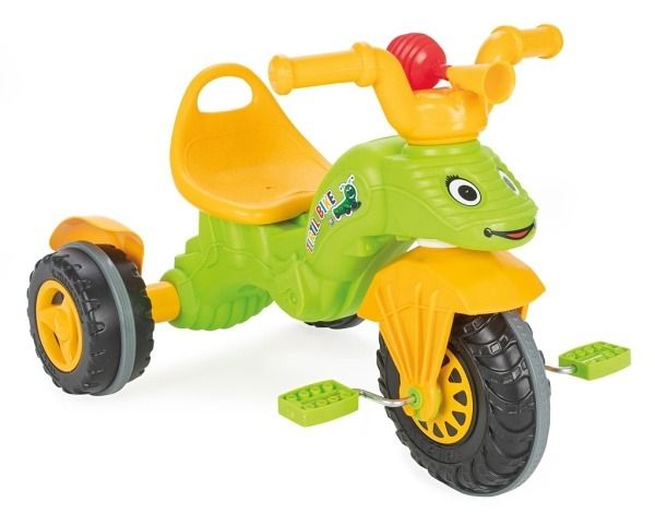 Tříkolka ve tvaru housenky, šlapky umístěny na předním kole. Nosnost 35 kg, ergonomický design. Mechanický klakson.