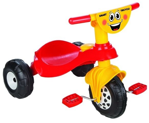 Tříkolka smart s klaksonem. Ovládá se pedály na předním kole, plastové pneumatiky a pohodlné sedlo. V červené barvě. Maximální nosnost 35 kg.