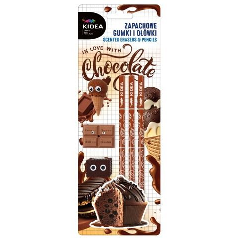 3 ks tužek a 3 ks pryží s vůní čokolády na blistru. Pryž ve tvaru zmrzliny, čokolády a sušenky.