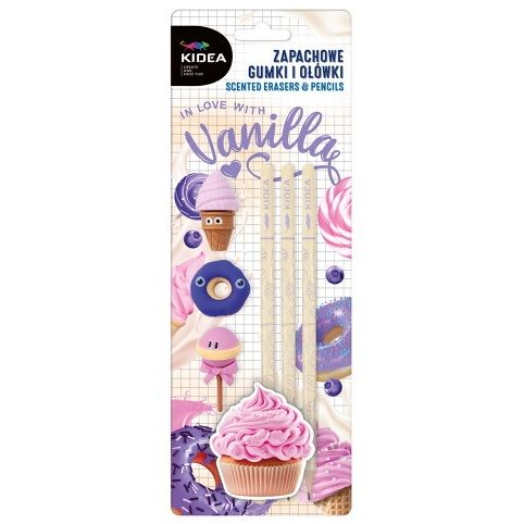 3 ks tužek a 3 ks pryží s vůní vanilky na blistru. Pryž ve tvaru zmrzliny, muffina a donuta.
