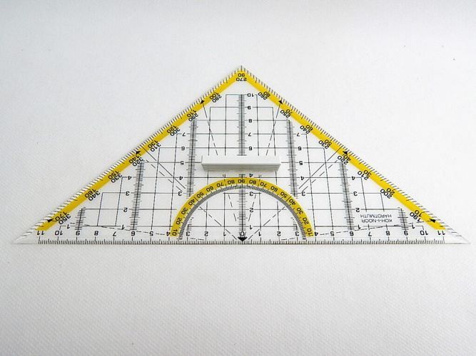 Trojúhelník 45/177 s držákem 703044 transparentní. Trojúhelník 45/177 vyrobený z čirého průhledného polystyrenu, ve středu opatřený bílým polystyrenovým držadlem je vhodný pro rýsování a měření přímek, kolmic, úhlů, rovnoběžek apod. Stupnice jsou tištěny technologií přesného sítotisku a při běžném používání jsou odolné proti opotřebení. Na přeponě milimetrová stupnice od středu vždy 11 cm na obě strany s ozmačením každého celého centimetru číslicí. Úhloměrová stupnice 0-180 stupňů na odvěsnách a oblouková úhloměrná stupnice 0 - 90 stupňů uprostřed přepony na obě strany. Stupnice s dělením po jednom stupni a označením každého desátého stupně číslicí. Obě úhloměrné stupnice jsou podbarveny žlutou barvou. Příčné milimetrové stupnice kolmé na přeponu umožňující kreslení rovnoběžek a kolmic s označením každého celého centimetru číslicí. Přesnost stupnic 0,2% délky. Trojúhelník je určený k rýsování a technickému kreslení ve škole i v kanceláři. Zabalen je do polyetylenového sáčku s eurozávěsem.