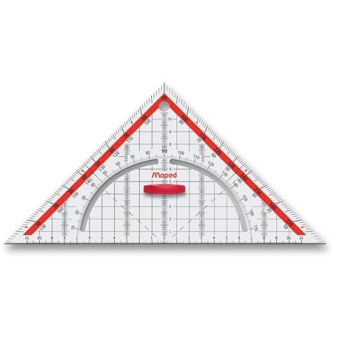 Trojúhelník s geometrickými funkcemi, 16 cm přeponou a držadlem.4 funkce:trojúhelník se stupnicísymetrické čáryparalelní čáryúhloměr
