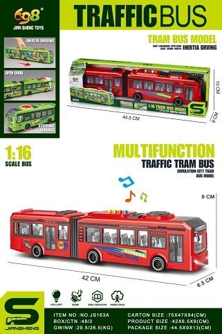 Trolejbus je v měřítku 1:16 ve červené barvě. Trolejbus je svými rozměry vhodný pro zábavu v interiérech. Na baterie: 3x LR44 (jsou součástí balení)