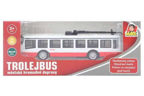 Kovový trolejbus s realistickým vzhledem v českém designu. Skvělý dárek pro všechny příznivce městských dopravních prostředků. Červenobíločernou barevnou kombinaci můžete vidět na prostředcích městské hromadné dopravy v některých našich městech.Trolejbus má výklopné troleje, otevírací dveře. Pohon je na zpětné natažení. Rozměry trolejbusu jsou cca 16 x 3 x 3 cm. Materiál kombinace kovu a plastu. Vhodné pro děti od 3 let