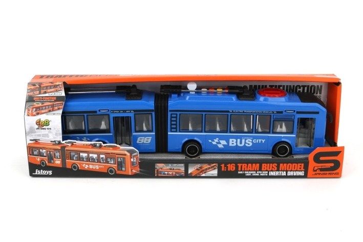 Trolejbus je v měřítku 1:16 ve modré barvě. Trolejbus je svými rozměry vhodný pro zábavu v interiérech. Na baterie: 3x LR44 (jsou součástí balení)