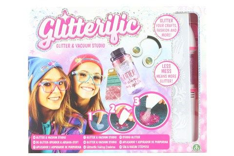 Třpytivé vakuové studio - vytvoř si originální zdobení na jakýkoliv předmět. Sada obsahuje: 1 aplikátor třpytek (aplikátor vypouští třpytky na oboustranně lepící samolepky a následně vysaje přebytečné třpytky), 2 archy s oboustranně lepícími samolepkami různých vzorů, 3 oboustranně lepící archy pro vytvoření vlastních tvarů a designu zdobení, náhradní ampuli s jinou barvou třpytek. Napájení aplikátoru 2x AAA/LR03 baterie - nejsou součástí. Rozměr balení cca 28 x 23 x 4 cm. Věk 6+