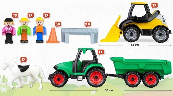 Set farma obsahuje: traktor s přívěsem, nakladač, 5× kužel, 2× dopravní zábranu, koně, 3× panáček