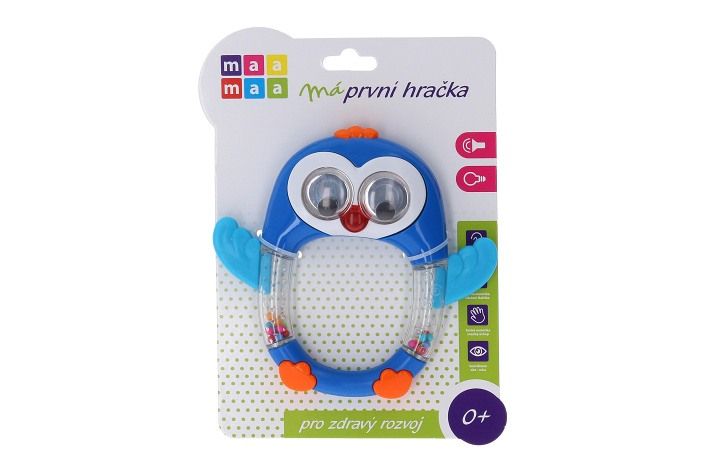 Tučňák chrastítko. Délka 15 cm. Vydává světelné a zvukové efekty. Napájeno bateriemi, které nelze vyjmout. 3xAG13 baterie součástí.