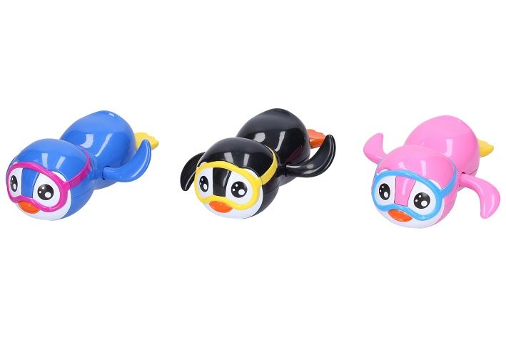 Tučňák do vody na natažení. Délka 12 cm. Display box 6 ks. 3 varianty - růžová, černá, modrá.
