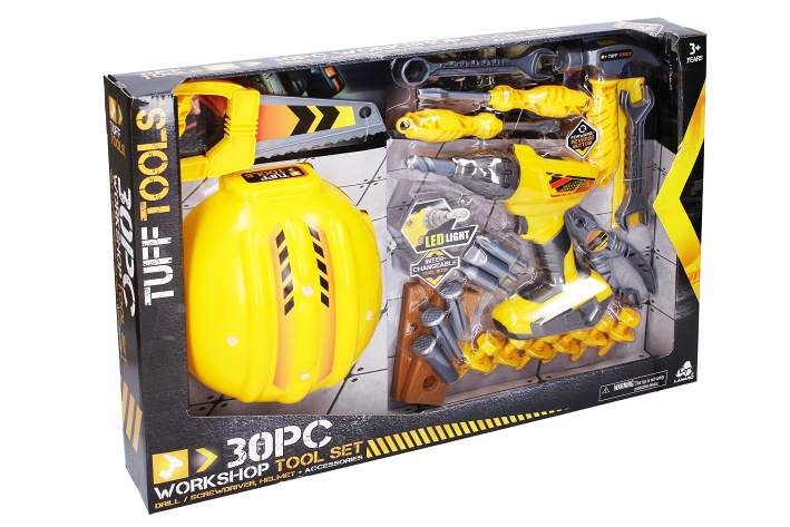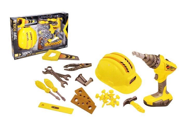Sada obsahuje přilbu, klíče, šroubováky, kleště, pilku, elektrickou vrtačku se světelnými efekty a 4 nástavci, kladívko a několik dílů a šroubků na montování. Celkem 30 ks.