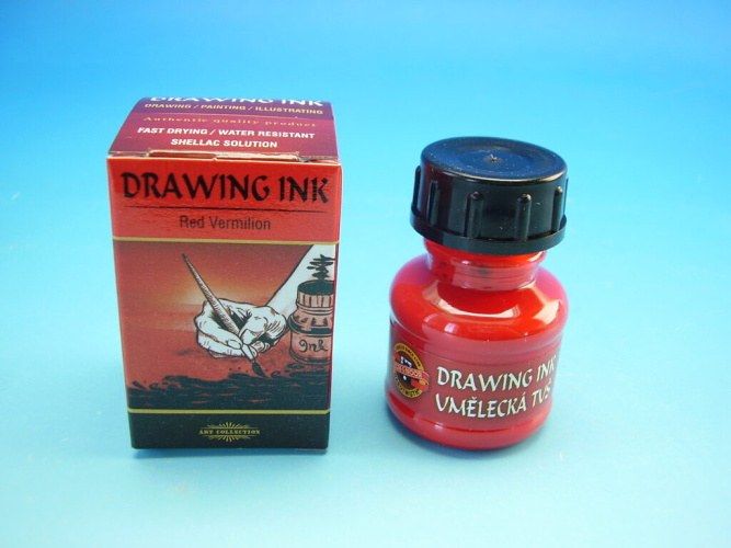 Tuš umělecká 2300 rumělka červená. Šelaková tuš obsahuje jemné pigmentové pigmenty, světlostálosti a kryvosti jsou u jednotlivých odsstínů vyznačeny na obalu 20 g lahvičky v krabičce . Tuš je vhodná pro malbu na papír - nebělený karton pro perokresbu. Po zaschnutí vytvoří vodě odolný film. nanáší se obyčejným perem /ne plnícím / nebo štětcem. Před použitím protřepat v lahvičce. Chránit před mrazem. Obsahuje borax. vyrábí se ve 14 barevných odstínech.
