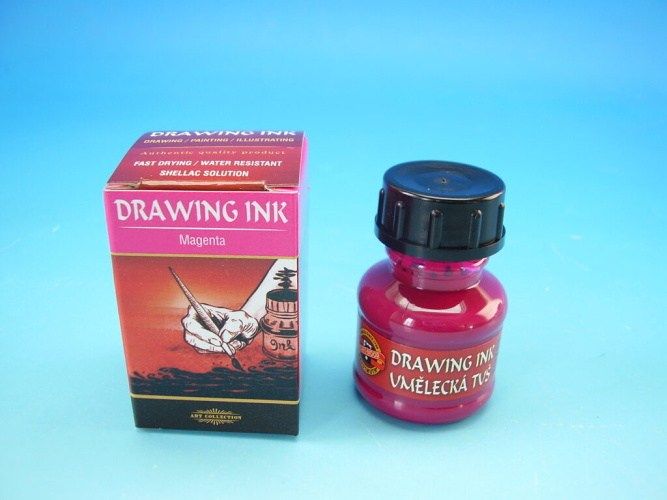 Tuš umělecká 2315 magenta. Šelaková tuš obsahuje jemné pigmentové pigmenty, světlostálosti a kryvosti jsou u jednotlivých odsstínů vyznačeny na obalu 20 g lahvičky v krabičce . Tuš je vhodná pro malbu na papír - nebělený karton pro perokresbu. Po zaschnutí vytvoří vodě odolný film. nanáší se obyčejným perem /ne plnícím / nebo štětcem. Před použitím protřepat v lahvičce. Chránit před mrazem. Obsahuje borax. vyrábí se ve 14 barevných odstínech.