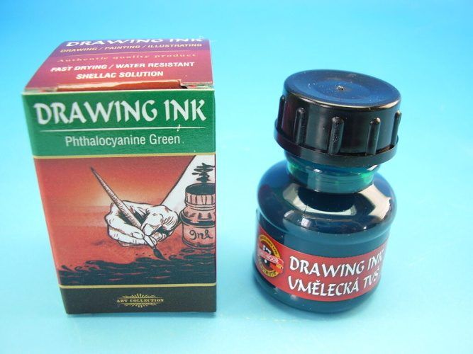 Tuš umělecká 2500 phthalocyaninová zeleň. Šelaková tuš obsahuje jemné pigmentové pigmenty, světlostálosti a kryvosti jsou u jednotlivých odsstínů vyznačeny na obalu 20 g lahvičky v krabičce . Tuš je vhodná pro malbu na papír - nebělený karton pro perokresbu. Po zaschnutí vytvoří vodě odolný film. nanáší se obyčejným perem /ne plnícím / nebo štětcem. Před použitím protřepat v lahvičce. Chránit před mrazem. Obsahuje borax. vyrábí se ve 14 barevných odstínech.
