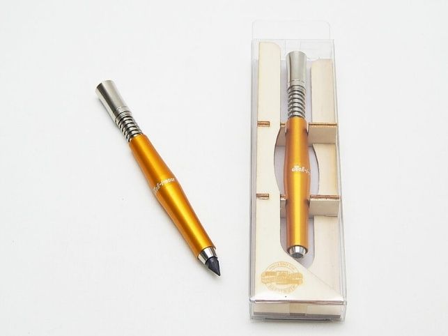 Tužka mechanická padací, bez klipu, s tuhou o průměru 5,6 mm je určená pro běžné psaní a kreslení. Plášť tužky je kovový (hliníková slitina) kruhového tvarového profilu, žlutě eloxovaný. Mezi hrotítkem a pláštěm je spojka hrotítka, na které je navlečena viditelná pružina. Tuha se posunuje stisknutím knoflíku hrotítka v nakloněné poloze tužky, tím dojde ke stlačení pružiny a otevření kleštiny a libovolnému vysunutí tuhy. V knoflíku je umístěno hrotítko, po odšroubování knoflíku lze hrotit tuhu. Grafitovou tuhu lze nahradit tuhami pastelovými. Mechanická tužka je uložena do dřevěného stojánku (překližka) a vložená do plastového transparentního PET obalu s eurozávěsem. Stojánek lze po vysunutí z PET obalu použít k odkládání tužky na stole. Logo Koh-i-noor je gravírované laserem na válcové části pláště a na vrchní straně stojánku.