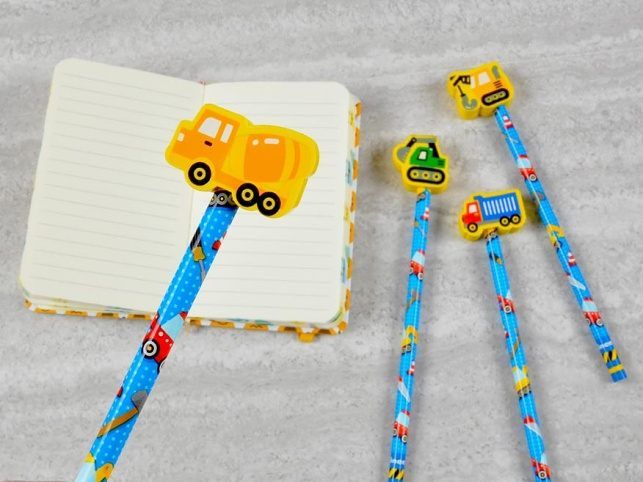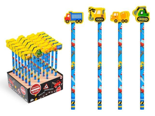 Grafitová tužka s gumou pro malé stavitele. Mix motivů - těžké stavební stroje: - nákladní auto - bagr - jeřáb - domíchávač Uvedená cena je za 1 ks