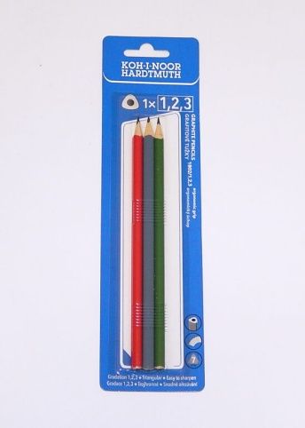 Souprava trojhranných grafitových tužek v gradaci č. 1, 2, 3. Tužky jsou v dřevěném plášti a v zeleném, červeném a šedém lakování, balené po 3 ks mix barev v blistru. Ergonomický trojhranný tvar umožňuje optimální držení a vedení tužky. Jsou určeny pro školáky, děti předškolního věku i pro univerzální použití.