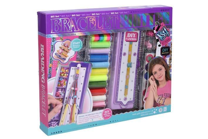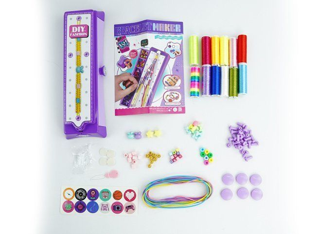 Tvorba náramků. Rozměry krabičky na uložení a zaplétání náramků 25x9x3. 5cm. Obsahuje různé barvy provázků na tvorbu náramků, korálky, nálepky. Obrázkový návod na zadní straně obalu.