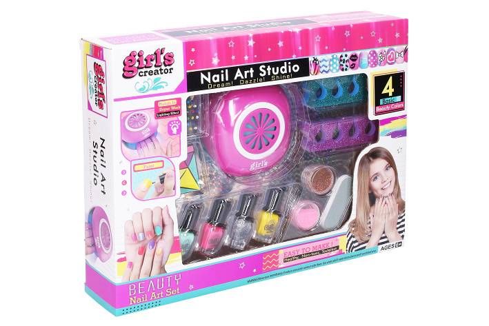 Tvorba nehtů s vysoušečem. Součástí vysoušeč, 4 barevné laky, třpytky, pilník, ozdoby a další. Světelné efekty vysoušeče. 2xAA baterie do vysoušeče nejsou součástí. Obrázkový návod na zadní straně obalu.